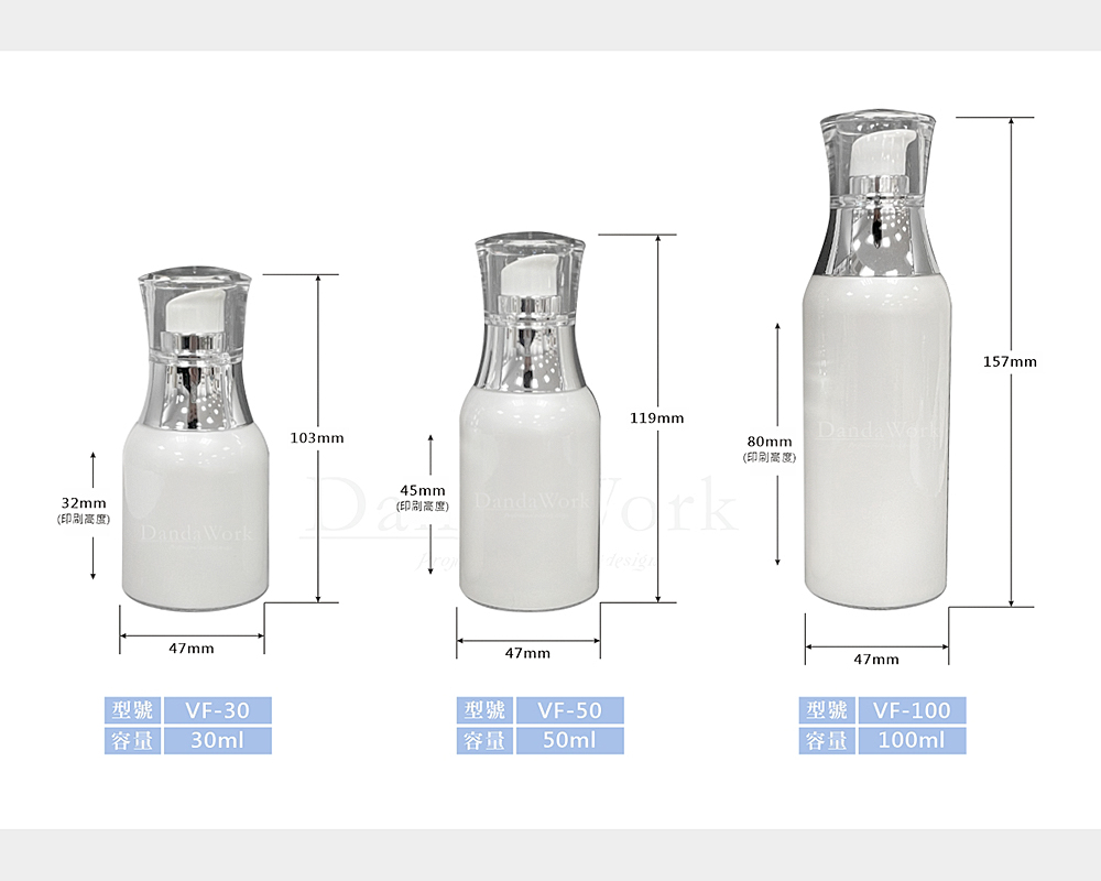 | VF-50 | 50ml | 47*118 | PETG塑膠瓶身+壓頭+透明AS上蓋 |